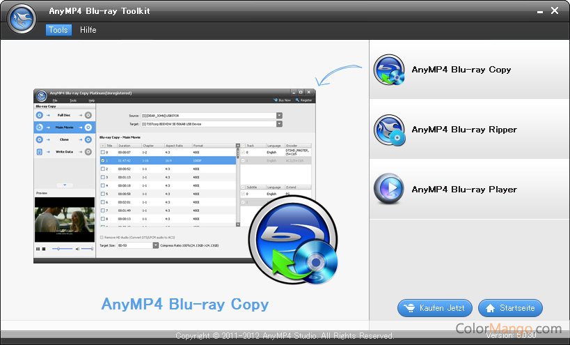 AnyMP4 Blu-ray Toolkit Funktionen 1. Blu-ray-Videodateien und Blu-ray-Discs abspielen 2. Rippen Sie Blu-ray in alle Videoformate 3. Kopieren Sie die Blu-ray-Disc und sichern Sie die Blu-ray auf die Festplatte 4. 4 Kopiertypen: Vollständige Disc, Hauptfilm, Klonen und Daten schreiben.