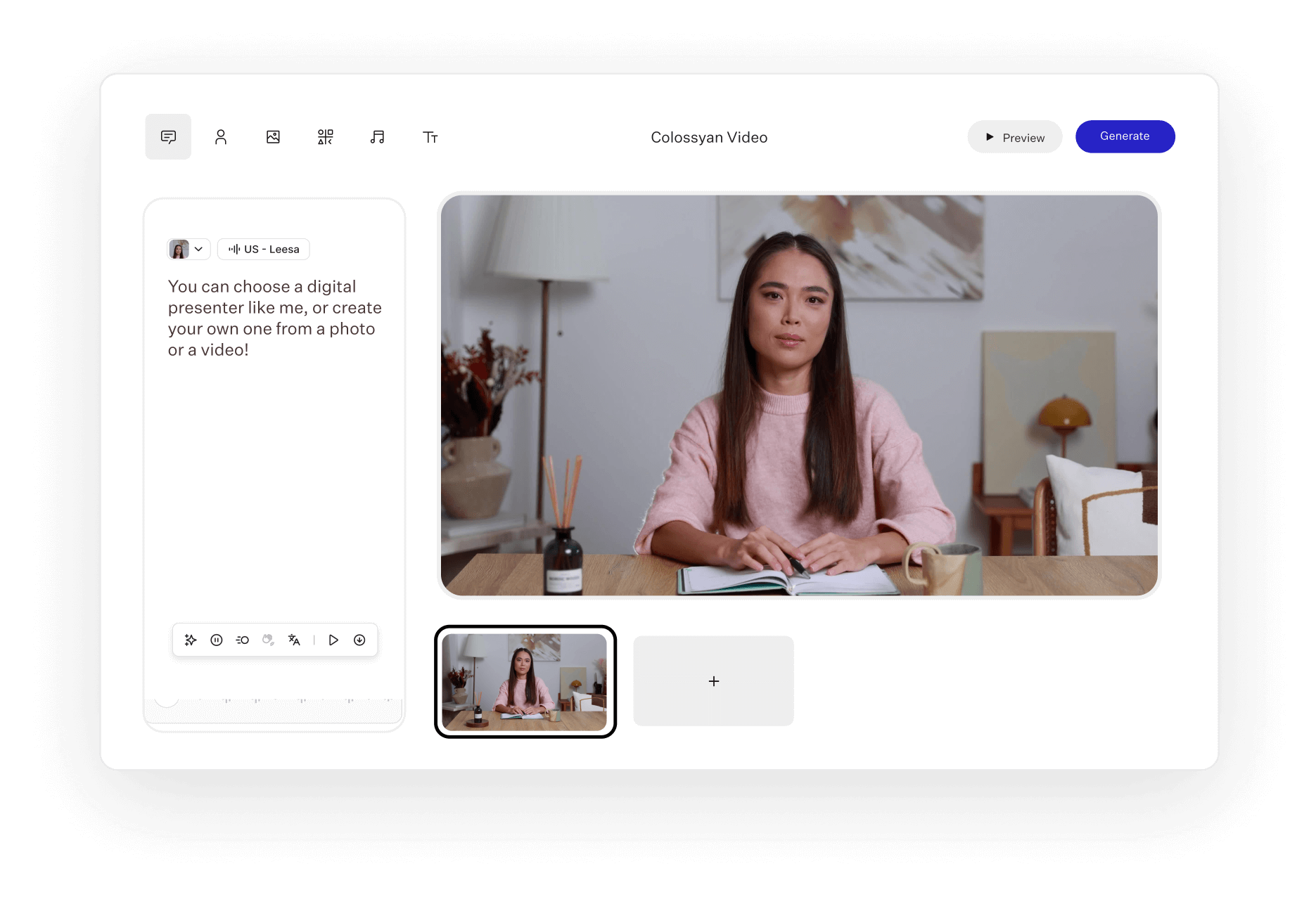 • Wählen Sie aus über 200 Premium-Avataren für KI und lokalisieren Sie Inhalte in über 70 Sprachen mit über 600 Stimmen und Akzenten.