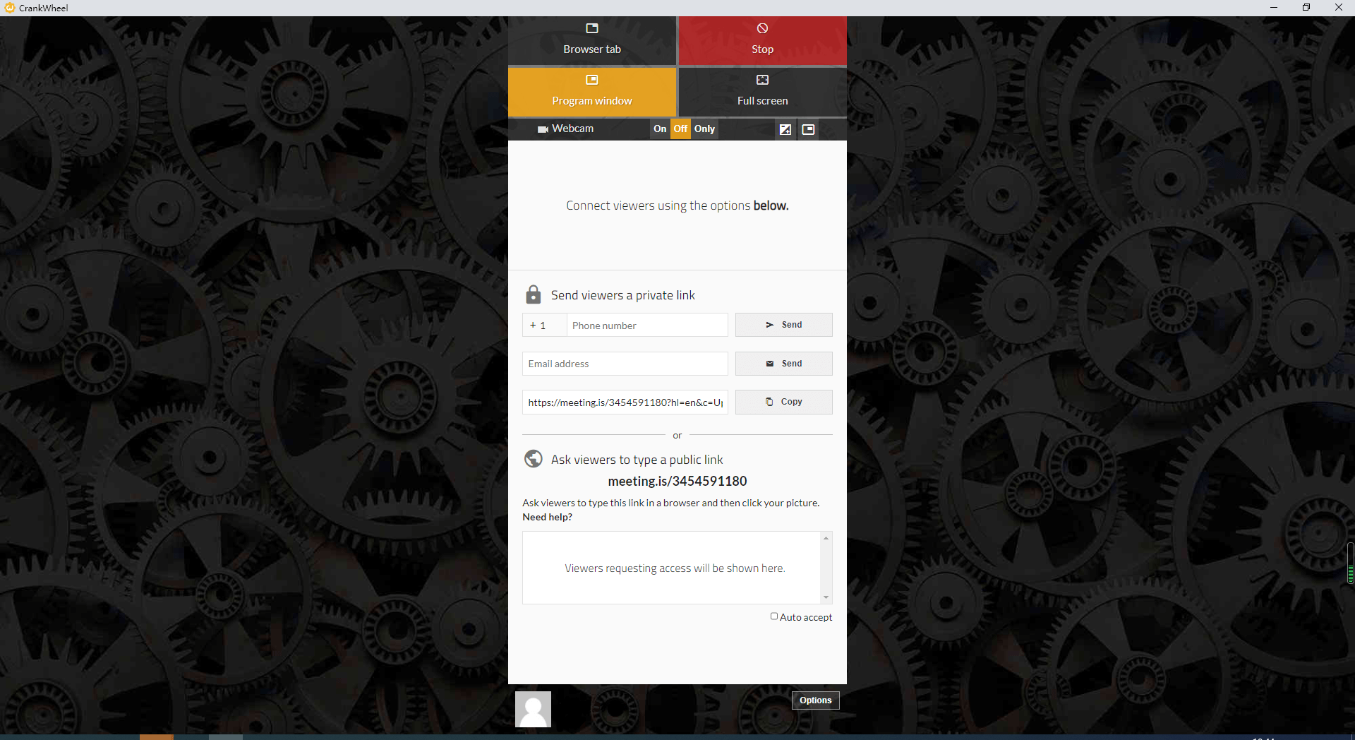 CrankWheel ist ein robuster Konnektor, über den Sie Ihre Produkte Ihren Kunden in Echtzeit präsentieren, ihre Fragen beantworten und ihre Probleme sofort lösen können. Unabhängig davon, ob Sie im Ausland arbeiten oder auf einer Geschäftsreise sind, hilft es Ihnen außerdem dabei, Besprechungen mit Ihren Kollegen über Bildschirmübertragung oder Webcam-Sharing abzuhalten oder sogar Computer fernzusteuern. Somit müssen Sie sich keine Sorgen mehr um die Aufmerksamkeit der Mitarbeiter machen, denn alle Kundenbedürfnisse und Anforderungen an Geschäftstreffen werden durch die schnellste Antwort von CrankWheel verschwinden!