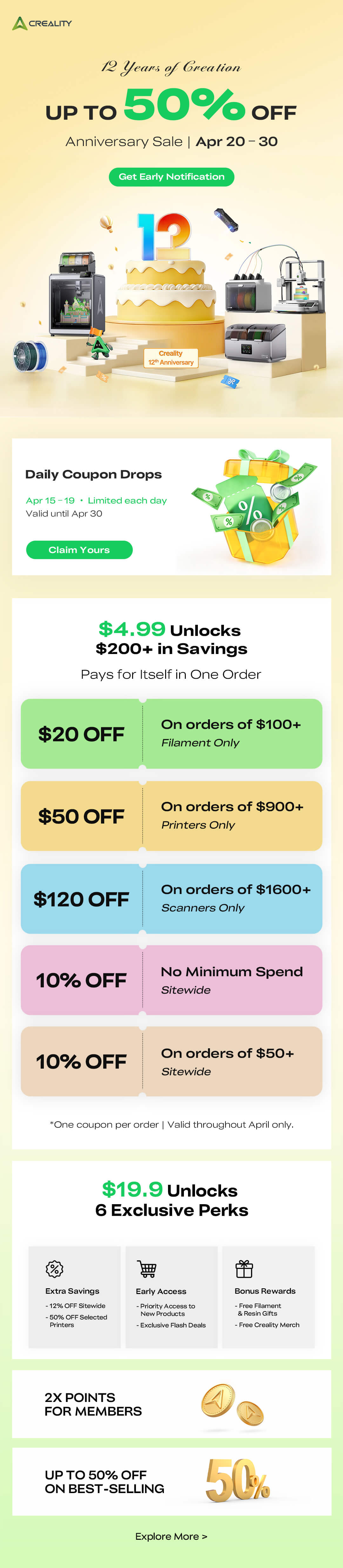 Im offiziellen Shop von Creality unter crealityofficialstore.sjv.io oder store.creality.com auf der Startseite, auf den Produktseiten oder im Checkout wurden keine aktuellen Aktionen, Banner oder Rabatte gefunden. Es gelten die Standardpreise, ohne dass Angebote auf der gesamten Website sichtbar sind.Verifizierte Rabatte und Promo-Codes