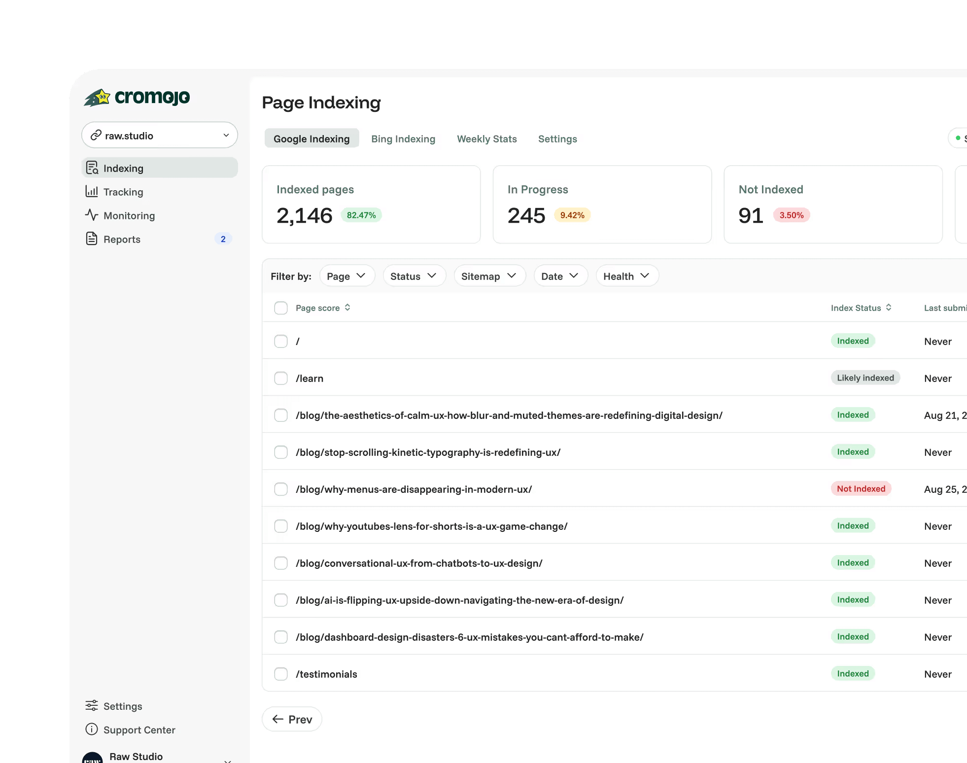 📈 Automatisierung der SEO-Indexierung Mit Massentools und intelligentem Tracking lassen sich Seiten schnell indexieren 🛠️ Überwachung der Website Erkennen Sie Probleme, bevor sie Sie Traffic oder Umsatz kosten 🔍 Analytik in Echtzeit Verstehen Sie, was den Umsatz antreibt, nicht nur die Seitenaufrufe 🤖 KI-gestützte Einblicke Personalisierte Tipps zur Steigerung der Konversionen 📬 Sofortige Benachrichtigungen Lassen Sie sich benachrichtigen, wenn etwas kaputt geht oder sich ändert 🧾 Benutzerdefinierte Berichte Exportbereite Zusammenfassungen für Teams oder Kunden