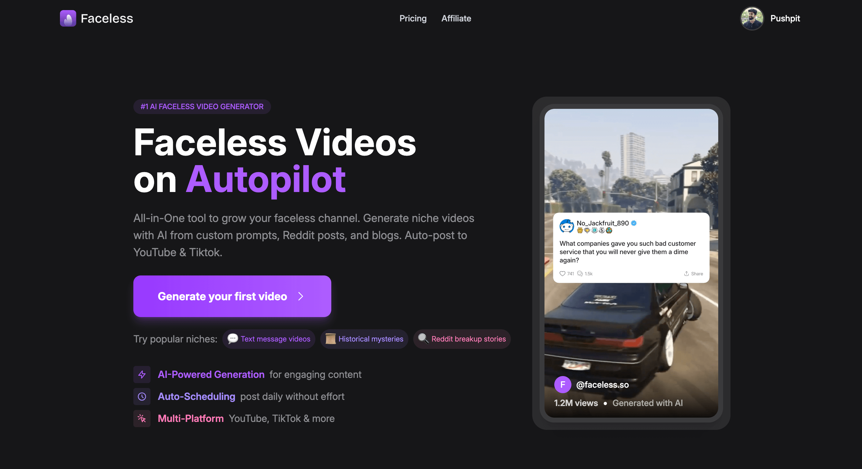Faceless.so ist ein All-in-One-Tool zum Generieren von KI-gesteuerten gesichtslosen Videos aus:
