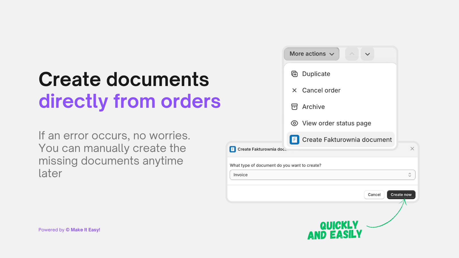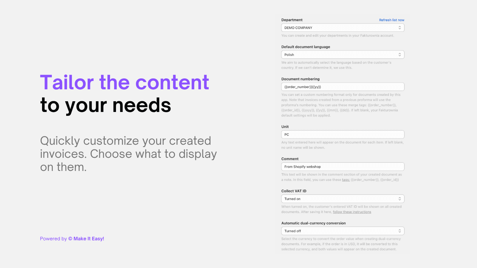 Fakturownia Die Integration erstellt und versendet automatisch EU-konforme Rechnungen aus Shopify-Bestellungen (Umsatzsteuer/OSS, B2B), wodurch Stunden an Rechnungsstellungsverwaltung eingespart werden.