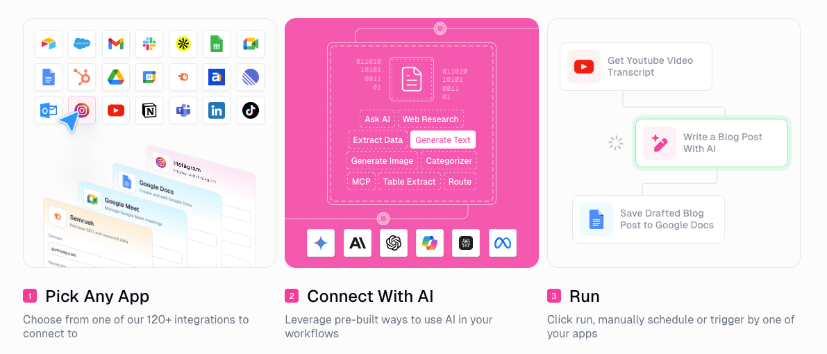 Stellt eine Verbindung zu vielen beliebten Diensten (z. B. Gmail, Slack, Google Sheets, Salesforce) her, um eine toolübergreifende Automatisierung zu ermöglichen.