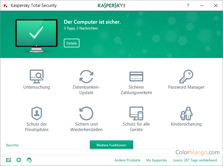 Kaspersky Pure hat eine klare und hübsche Benutzeroberfläche. Es schützt meinen Computer stark und stört mich nie mit zu vielen Benachrichtigungen. Es beeinflusst niemals die Computerleistung. Kaspersky ist perfekt mit meinem Computer kompatibel. Sorgen Sie dafür, dass mein Computer sicher läuft. Außerdem wird es mich nicht stören. Wenn Sie einen Sicherheitsschutz haben möchten, ist Kaspersky meiner Meinung nach der beste für Sie. Ich habe Norton, Bitdefender und andere Sicherheitsprogramme schon einmal verwendet, und keines davon hat mich zufrieden gestellt. Vertrauen Sie mir, Kaspersky ist das Beste.Auf diesen Beitrag antworten