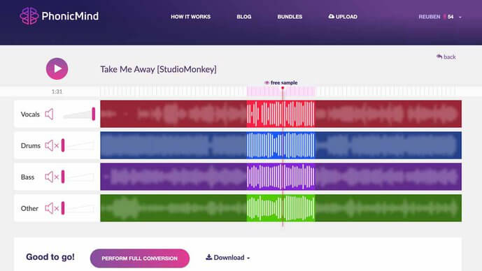 Du kannst eine Audiodatei hochladen, dir die Trennung sofort ansehen, ohne dich registrieren zu müssen, und dann Stems wie Gesang, Instrumental, Schlagzeug, Bass und andere Elemente für Zwecke wie Karaoke, Acapellas, Minus-Eins-Übungstracks und Remixe exportieren.