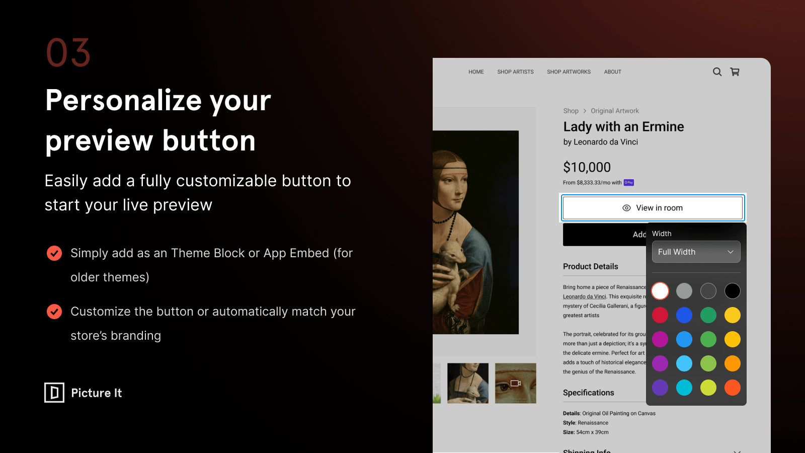 Eine Shopify AR-App für Kunstgeschäfte, mit der Käufer vor dem Kauf eine Vorschau der Kunstwerke an ihren eigenen Wänden ansehen können (AR/virtuelle Ausstellungsräume), wodurch die Konversionen gesteigert und die Retouren reduziert werden.