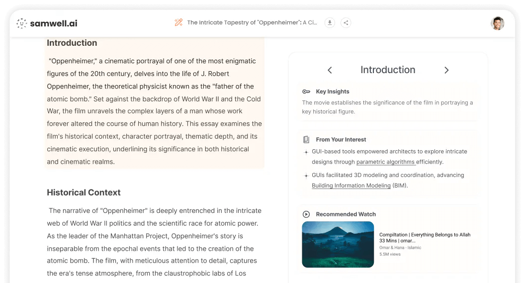 Samwell AI sorgt für plagiatfreie Inhalte, bietet Zitate im Text und bietet Videovorschläge zur Verbesserung des Schreibens. Es priorisiert auch die Privatsphäre der Benutzer und den Datenschutz. Obwohl es in erster Linie für akademisches Schreiben konzipiert wurde, können seine Funktionen für eine Reihe von Schreibaufgaben nützlich sein.