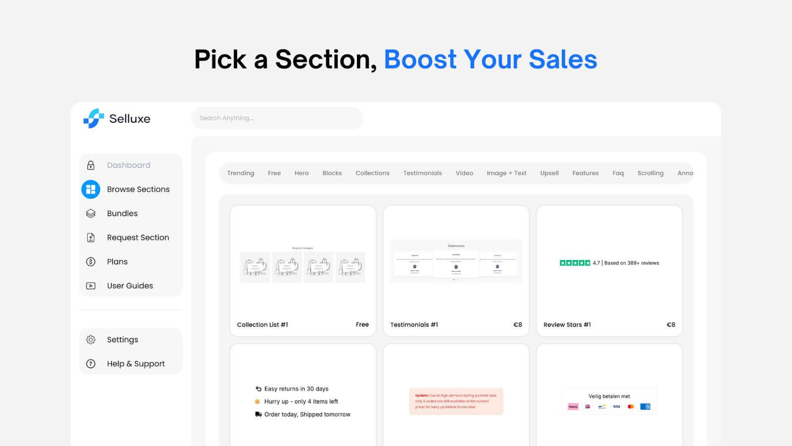 Fügen Sie Shopify-Abschnitte mit hoher Konversionsrate in Sekundenschnelle zu jedem Theme hinzu — ganz ohne Programmierkenntnisse.