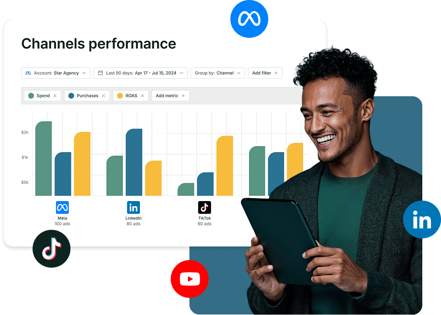 Kanalübergreifende Dashboards: Kombinieren Sie die Leistung von Meta, TikTok, LinkedIn und YouTube an einem Ort.