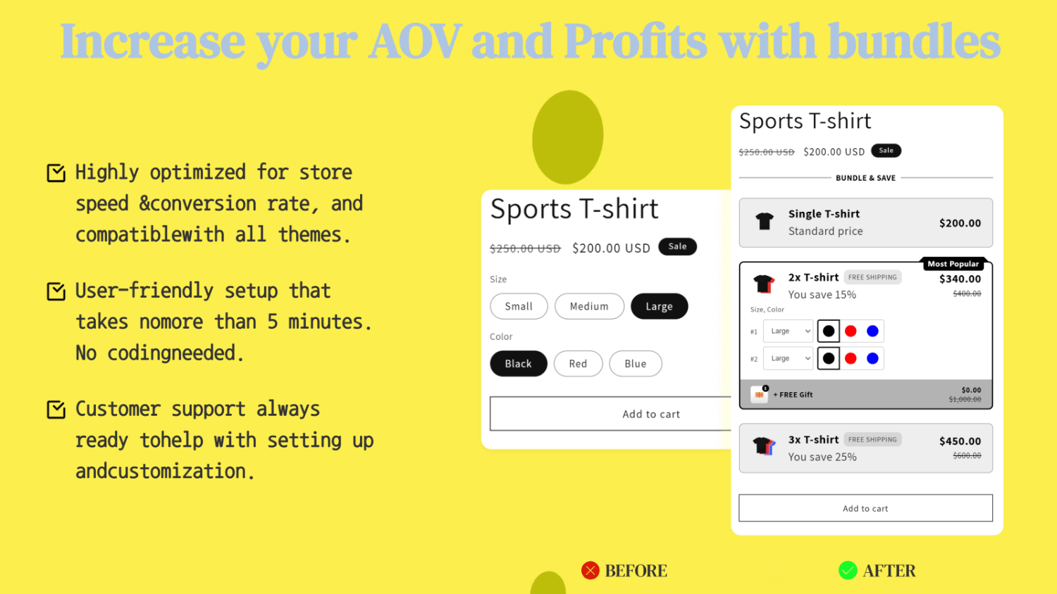 Steigern Sie den AOV mit Paketen, Mengenrabatten, BOGO-Angeboten, Geschenken und A/B-getesteten Upsell-Angeboten.
